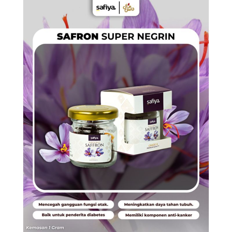 Saffron merupakan rempah-rempah alami berasal dari tanaman bunga saffron crocus. Saffron Safiya diproduksi dari perkebunan saffron di Afganistan yang sudah tersetifikasi keasliannya dan dipanen secara manual sehingga tidak mengurangi manfaat dari saffron.