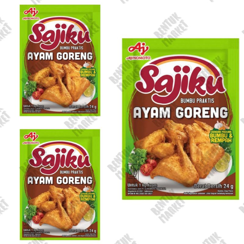Sajiku Bumbu Praktis Ayam Goreng adalah bumbu praktis yang dibuat dengan bumbu & rempah yang melimpah, membuat Ayam Goreng menjadi lezat dan berbumbu, tanpa tambahan bumbu lainnya. Dalam kemasan sachet isi 24 gram.