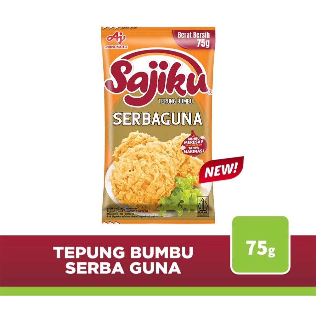 Sajiku® Tepung Bumbu Serbaguna merupakan tepung bumbu serbaguna yang dapat digunakan untuk menggoreng berbagai jenis masakan seperti ayam, ikan, udang, tahu, tempe, sayuran, dll. Kelebihan dari Sajiku® Tepung Bumbu Serbguna ini adalah :