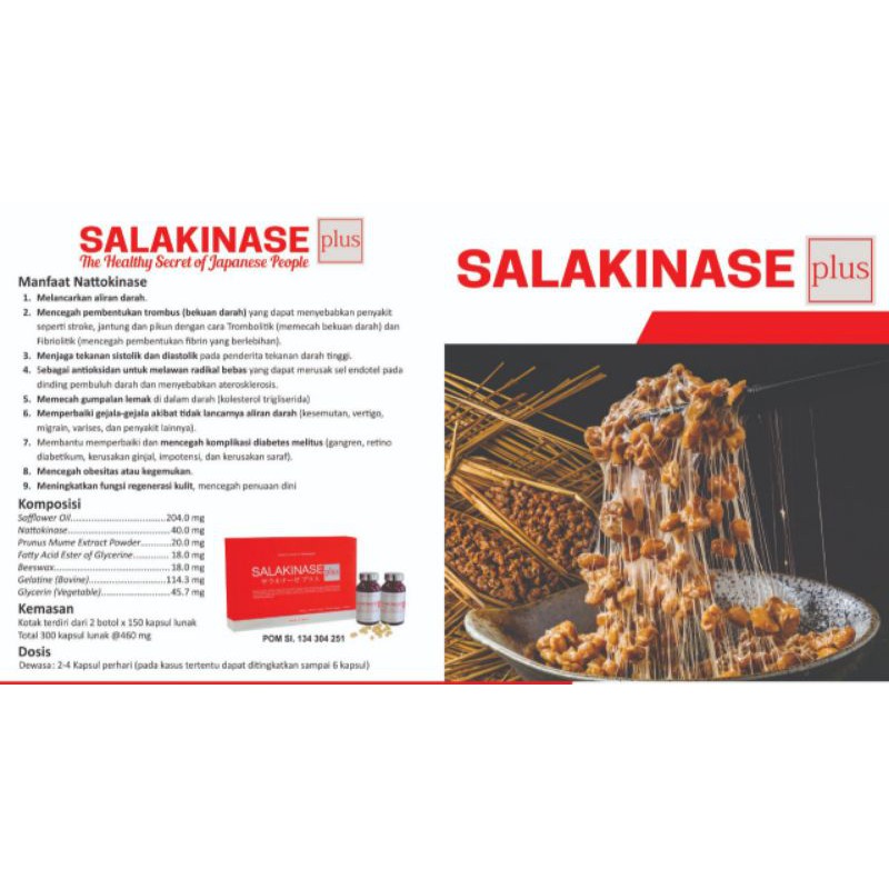 SALAKINASE PLUS terbuat dari ekstrak enzim nattokinase yang terdapat pada natto, makanan khas masyarakat Jepang yang bersumber dari hasil fermentasi kedelai yang menggunakan bakteri Bacillus subtilis natto sawamura. Pada hasil fermentasi terjadi produksi lendir yang keluar dari proses tersebut, pada lendir inilah terdapat enzim nattokinase yang telah terbukti dapat mengencerkan darah secara alamiah dan aman.