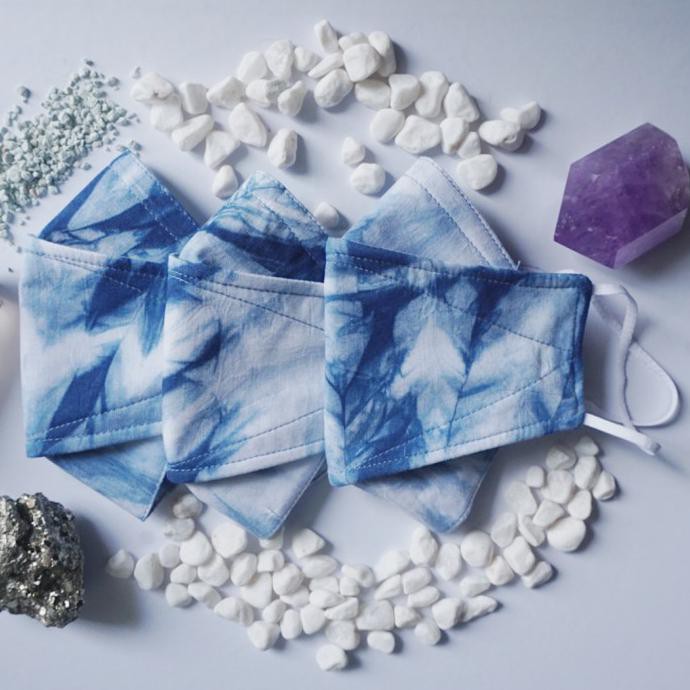 Dicelup menggunakan pewarna alami indigo dengan motif signature Binzu, Samudra Origami Mask memiliki motif yang serupa namun tidak sama pada setiap maskernya dikarenakan proses buatan tangan dari mulai pembuatan motif hingga proses pencelupan.