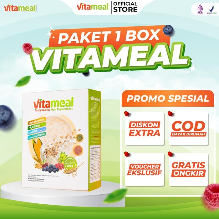 ?Vitameal adalah sereal sehat yang hanya terbuat dari bahan-bahan unggulan tinggi gizi. Vitameal dikenal sebagai cereal with high nutrition atau “sereal yang kaya akan gizi”. Sereal yang satu ini disarankan untuk dikonsumsi sebagai pengganti makanan. Cara mengonsumsinya pun terbilang mudah sehingga Vitameal cocok sekali untuk kamu dengan aktivitas padat dan tidak sempat sarapan.