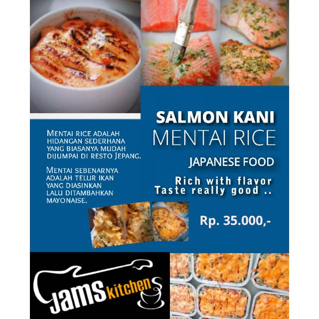 Ikan Salmon, Kani (stick ikan kepiting), Nori (bubuk rumput laut), Tobiko (salah satu jenis telur ikan yang paling umum digunakan dalam sushi dan masakan Jepang lainnya), kecap asin, sesame oil, mayonnaise...