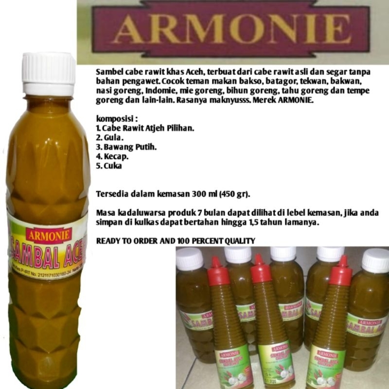 Sambel cabe rawit khas Aceh, terbuat dari cabe rawit asli dan segar tanpa bahan pengawet. Cocok teman makan bakso, batagor, tekwan, bakwan, nasi goreng, Indomie, mie goreng, bihun goreng, tahu goreng dan tempe goreng dan lain-lain. Rasanya maknyusss. Merek ARMONIE.