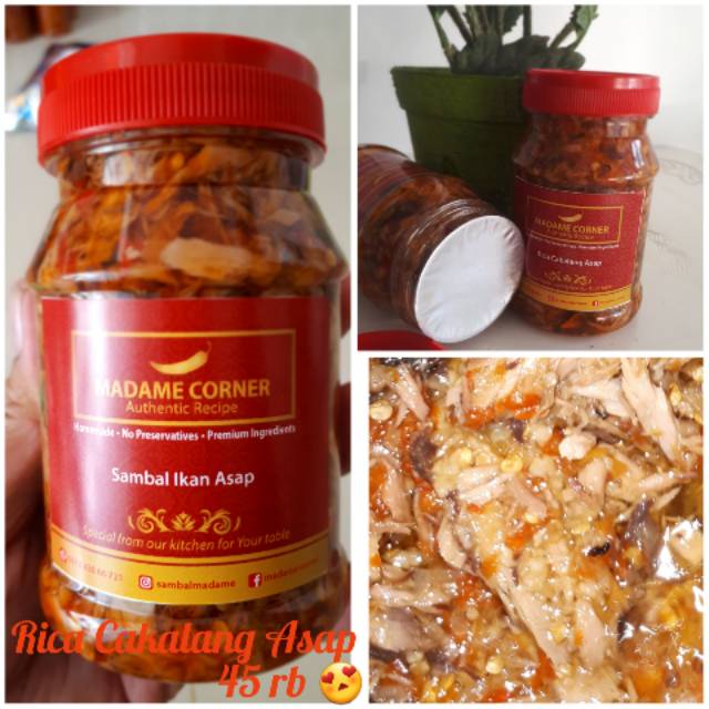 Sambal Cakalang Asap Rica ini sangat lezat karena di racik dengan cabe segar, dan bumbu bumbu yang khas dari dapur madame chilli corner. ikan CAKALANG ASAPNYA pun di produksi sendiri secara tradisional sehingga menghasilkan wangi ikan asap yg sangat khas. Sangat berbeda dengan cakalang asap yg di jual di lapak lain, boleh di bandingkan!. produksi kami menggunakan premium ingredient, resepnya pun authentic.