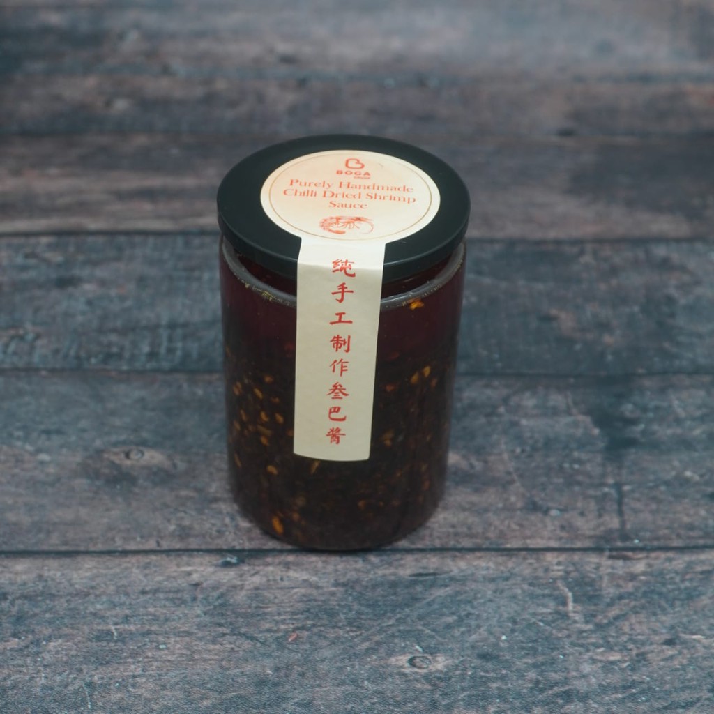 Sambal ebi sauce dikemas dalam botol, diproduksi dengan bahan utama ebi, sangat cocok dimakan dengan lamian atau nasi