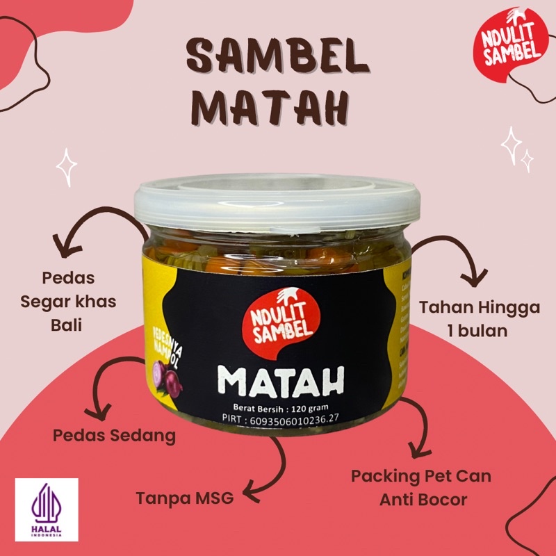 Sambel Khas Bali dimasak dengan bumbu dan bahan pilihan seperti cabai, serai, bawang merah, bawang putih, terasi, daun jeruk, jeruk limau serta ditambah dengan bumbu pilihan. Aroma sambal yang menggugah selera, sangat cocok dinikmati dengan berbagai jenis makanan. Mudah dibawa kemana saja dan bisa digunakan untuk tambahan masakan sesuai selera.