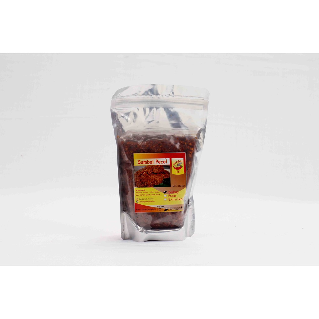 SAMBAL PECEL MADIUN / BUMBU PECEL MADIUN "UTI" Sambal pecel adalah salah satu variasi jenis bumbu kacang. Sambal pecel digunakan untuk bumbu makanan yang dilengkapi dengan sayuran dan beberapa lauk tradisional seperti tempe, tahu, peyek, Kering, dan lauk lainnya. Tiap daerah memiliki ciri khas sambel pecel berbeda, ada yg cenderung manis, asin dan pedas!! 100% Produk Lokal dan halal Bahan: Kacang tanah, cabe segar, gula merah, garam, dan daun jeruk. Diproduksi oleh: Sambal Uti Madiun JAWA TIMUR P-IRT No: 2113577010242-25 Berat: 250 g Supported by: UMKM Kita Bisa, item ini tentunya merupakan produk unggulan terseleksi dan bisa langsung langsung kamu dapatkan secara online. Tentunya melalui proses QC sebelum dikirim langsung ke lokasi anda yaa!! Yuk diorder !! Happy Shopping