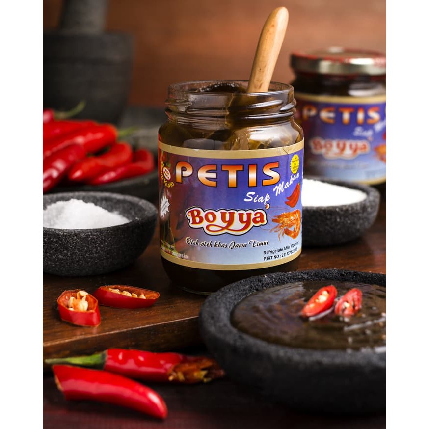 Sambal petis boyya merupakan sambal khas asli surabaya. Dibuat dari komposisi sari udang dan rempah pilihan. sambal petis boyya cocok untuk segala macam camilan dan makanan khas jatim. Mempunyai rasa pedas yang pas sehingga dapat langsung dicocol dengan krupuk atau makanan ringan lainnya. Sambal ini sangat cocok untuk dibawa kemanapun. selain itu sambal petis juga banyak dijumpai untuk dipasangkan dengan makanan khas indonesia khususnya daerah jawa timuran. Berikut berbagai macam makanan tradisional indonesia yang berbumbu sambal petis :