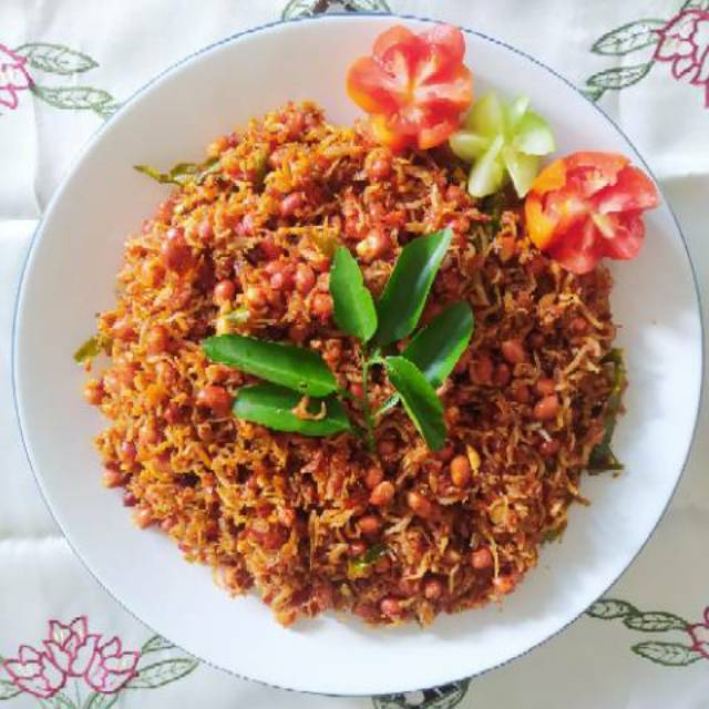 Sambal Teri Kacang yang gurih dan nikmat. Menggunakan bahan utama Teri Medan dan Kacang Tanah pilihan. Disertai daun jeruk yang menambah aroma dan cita rasa.