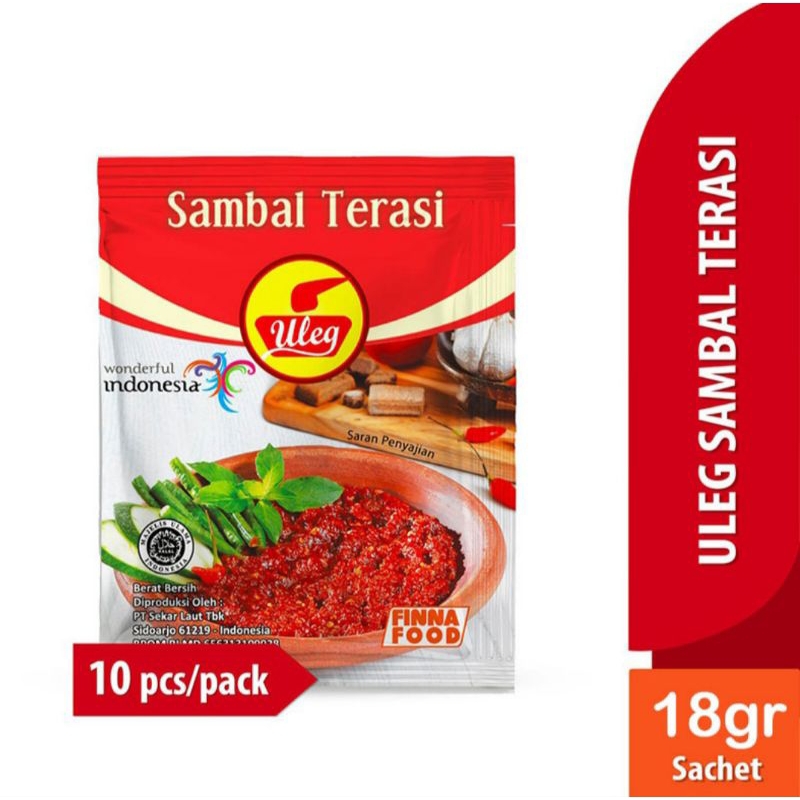 Uleg Sambal Terasi 10 x 18 g adalah sambal uleg terasi ala rumahan yang diolah dari cabe segar pilihan, dikombinasikan dengan terasi dan bumbu yang berkualitas untuk menjadikan hidangan bersama keluarga lebih nikmat. Dapat digunakan sebagai pendamping berbagai macam makanan seperti sambal untuk ayam goreng, bahan dasar balado, penyetan, bahan dasar nasi goreng, cah kangkung, bahan dasar masakan dan lain sebagainya. Tersedia dalam kemasan sachet pack isi 10 pcs.