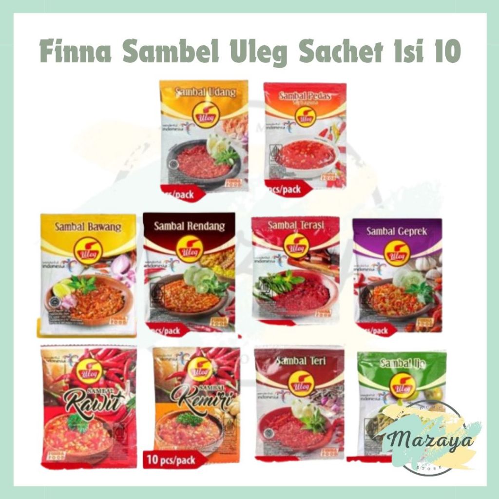 PAKET 10 SACHET Ini brand dari Finna Food, satu brand dari Jawa Timur yg terkenal akan pengolahan modern instan dgn bahan hasil laut termasuk saus-sambal peruntukannya. Kuda hitam ini bergerilya di pasar nasional dibalik bayang2 brand perusahaan2 besar nasional lainnya, bermodalkan produk2 berkualitas terbaik anak bangsa dgn rasa produk yg enak di lidah Indonesia. Salah satunya adalah brand Uleg, produk sambal2 tradisional yg terolah instan dan modern. Menggunakan bahan2 lokal berkualitas dan jenis2 sambal yg unik. Dari Uleg ini, Finna melebarkan pasar mereka di Indonesia berbekal produk berkualitas dgn atribut BPOM RI dan Halal MUI. Produksi PT. Sekar Laut Tbk - Sidoarjo, sambal tradisional khas Indonesia yg enak dan praktis higienis siap santap setiap saat! Dikemas dalam berbagai kemasan, salah satunya kemasan sachet Varian: 1. SAMBAL PEDAS SERBAGUNA 2. SAMBAL BAWANG 3. SAMBAL IJO 4. SAMBAL KEMIRI 5. SAMBAL RAWIT 6. SAMBAL TERASI 7. SAMBAL TERI 8. SAMBAL UDANG 9. SAMBAL RENDANG 10. SAMBAL GEPREK