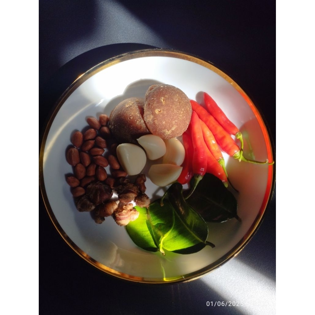 Komposisi : Kacang Tanah, Gula merah, Cabe Rawit, Bawang, Daun Jeruk, Kencur, Garam, Terasi Bubuk