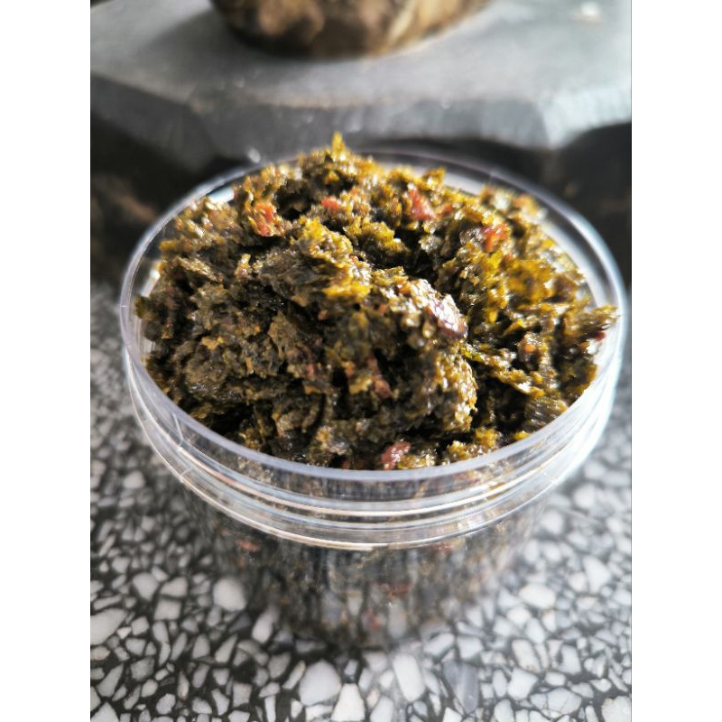 sambel rumput laut ini cocok sekali untuk teman makan, pedasnya mantul, dan rasanya enak banget. ada tekstur crunchynya . kemasan toples. berat produk +-70gr
