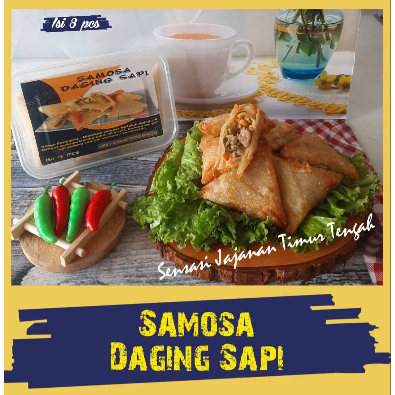 SAMOSA cemilan yang pas dengan isian daging sapi cincang, wortel, cabai hijau dan bawang Bombay. cocok di sajikan hangat hangat.