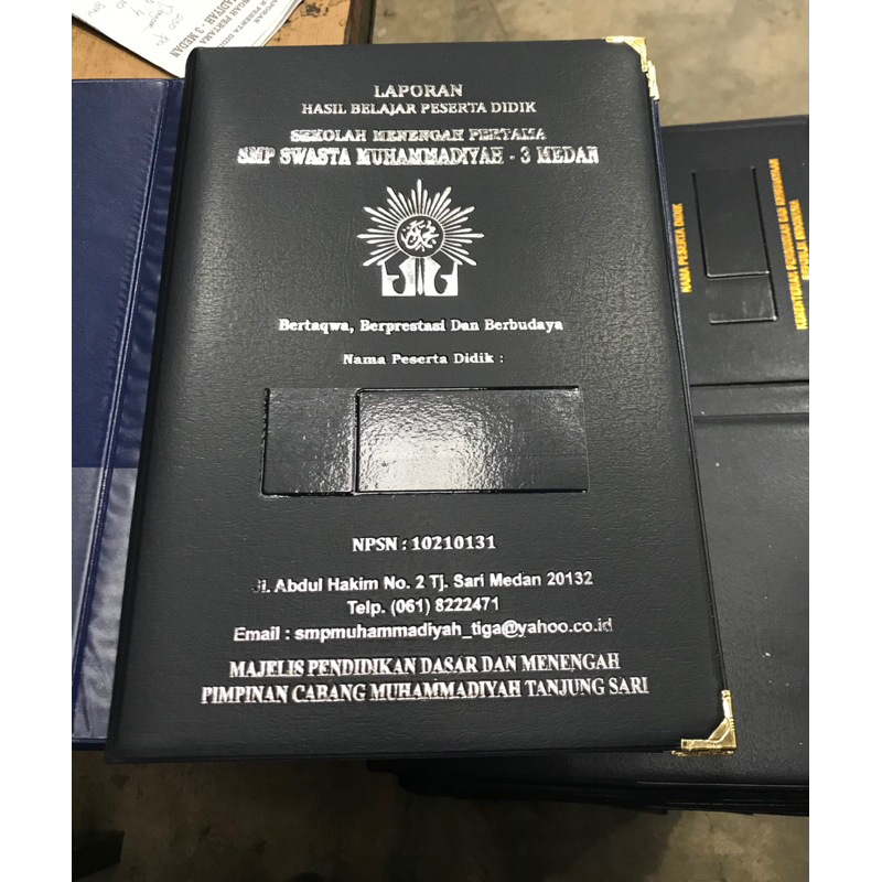 sampul Raport Bahan Kulit, emboss, plastik isian doff, siku emas sudut