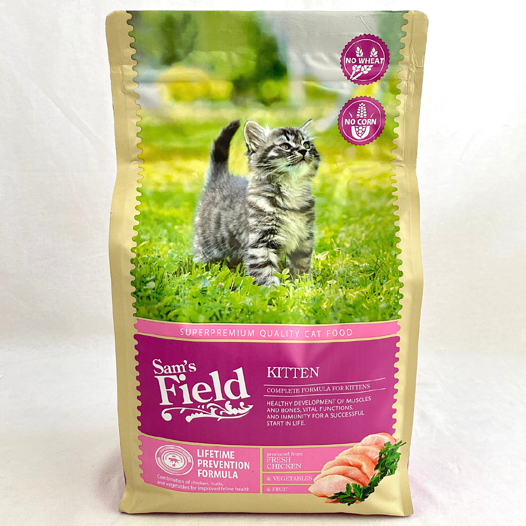 Sam's Field kitten food is a complete food for your kitten and composed with thebest ingredients. Sam's Field food contains fresh chicken, vegetables and fruitthat ensure good health. Sam's Field kitten food contains no grain and corn andensures the correct development of the muscles, bones, vitality functions andimmunity for a successful start. Everything you need to give your kitten thebest start.-Contains 48% chicken-For the best start-Develop muscle, bone and vital functions
