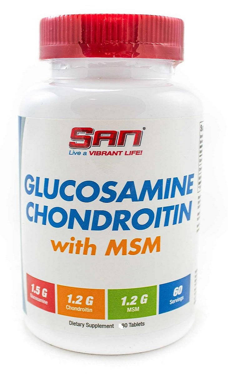 SAN Glucosamine Chondroitin MSM, купить который в Киеве по лучшей цене в Украине вы можете в магазине Mordex.Net, – это универсальный комплекс, в составе которого содержатся питательные нутриенты. Они, согласно многочисленным исследованиям и научно доказанными методами, укрепляют суставы, связки и активируют защитные механизмы, особенно против воспалительных процессов, нашего организма. В каждых 3-х таблетках, составляющих одну порцию добавки SAN Glucosamine Chondroitin MSM, содержится: 1,5 г глюкозамина; 1,2 г хондроитина; 1,2 г метилсульфонилметана. Основные свойства и характеристики SAN Glucosamine Chondroitin MSM: Укрепляет суставы и костную ткань; Снижает риск возникновения воспалительных процессов; Нормализует кислотно-щелочной баланс; В составе только клинически проверенные и качественные ингредиенты; Обладает сертификатом HPLC. Отзывы про Glucosamine Chondroitin MSM для суставов и связок в Украине Универсальный комплекс Glucosamine Chondroitin MSM предназначен для поддержки в здоровом состоянии и нормального функционирования опорно-двигательной системы, от которой зависит активность человека, что особенно важно для любого атлета. Поскольку суставный аппарат, скелет, хрящевые ткани несут на себе одну из основных нагрузок, их необходимо регулярно обеспечивать питательными веществами для их нормальной и качественной работоспособности. С этим отлично справляется биодобавка для суставов и связок Glucosamine Chondroitin, в которой содержатся три главных компонента (хондроитин, глюкозамин и метилсульфонилметан), способных поддерживать в рабочем и здоровом состоянии суставы, связки, кости. Глюкозамин – это естественное вещество, которое содержится в хрящах, входит в состав хондроитина и синовиальной жидкости. Он участвует в формировании и восстановлении хрящевой ткани, так как с его помощью происходит синтез глюкозаминглюканов, которые способствуют укреплению суставных хрящей. Именно поэтому глюкозамин считается стимулятором восстановления поврежденных хрящей, и, кроме этого, воздействуя на метаболические процессы, происходящие в них, предотвращает разложение и распад хрящевой ткани. Глюкозамин – это отличное противовоспалительное вещество, которое к тому же способствует уменьшению боли в суставах, так как быстро восстанавливает их после травм и повреждений. Благодаря глюкозамину, хрящи интенсивнее впитывают жидкость, что приводит к их смягчению, а также увеличивает приток нутриентов. Метилсульфонилметан способен снижать кислотность в организме и имеет противовоспалительные свойства. Это вещество поддерживает и нормализует кислотно-щелочной баланс, активно участвует в производстве и активации тиамина, витаминов группы С, биотина и пантотеновой кислоты. Хондроитин, который вырабатывается благодаря глюкозамину, также обеспечивает прочность хрящей и костей и поддерживает их в рабочем, здоровом состоянии. Он способствует восстановлению клеток хиндроицитов, которые входят в состав хрящевой ткани. Это вещество угнетает ферменты, которые активируют дегенеративные реакции, нормализует обменные процессы. Хиндроитин препятствует снижению количества кальция в костях, что значительно укрепляет их. Он существенно повышает выработку синовиальной жидкости, являющейся внутрисуставной смазкой, что предупреждает трение костей, увеличивая подвижность суставов, и обеспечивает их питатель
