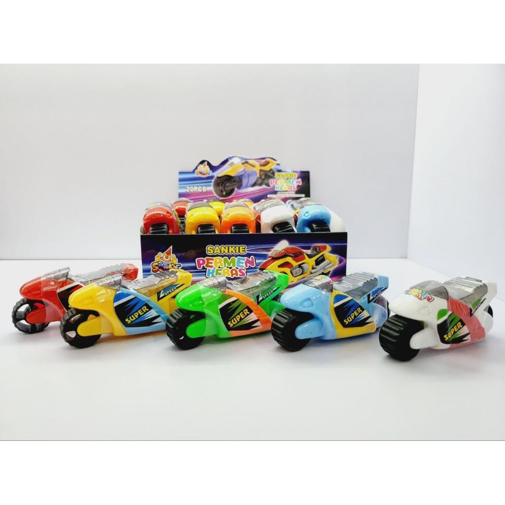 permen keras aneka rasa buah dengan maianan bentuk sepeda motor balap,mainan cukup kokoh dan sangat di sukai anak²