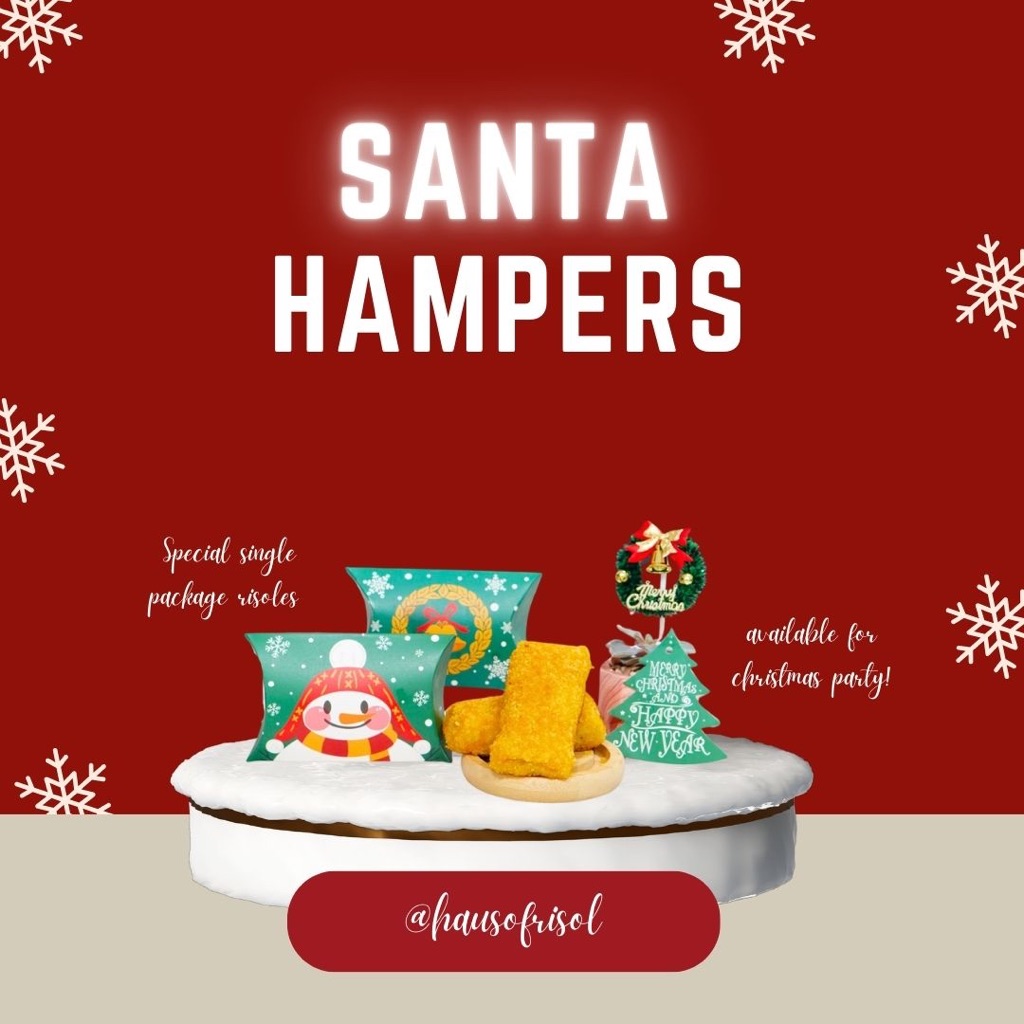 Santa hampers cocok untuk pelengkap acara / pesta kamu bersama teman dan keluarga. Harga yang tertera untuk satuan 1pcs risol