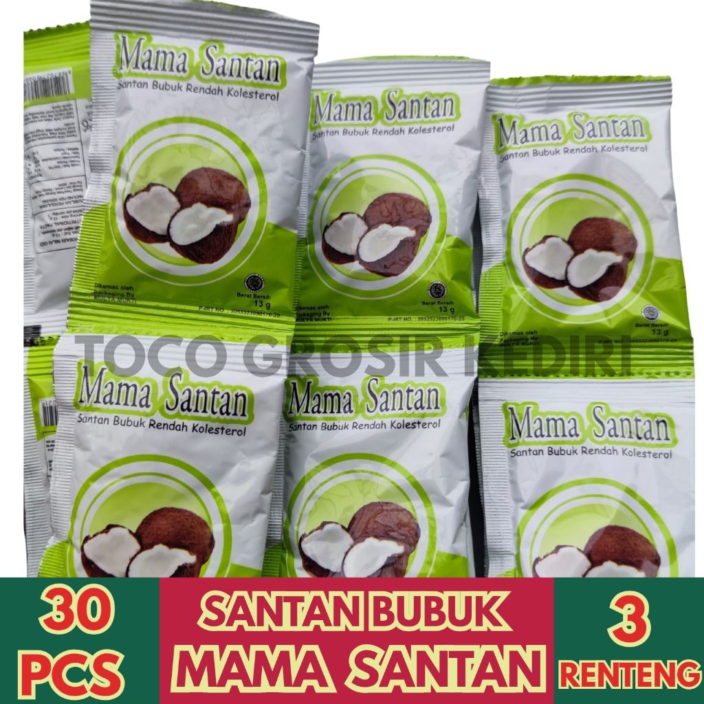 Santan Bubuk Mama Santan adalah produk santan bubuk yang dijual dalam kemasan 3 renteng dengan jumlah sachet sebanyak 30 sachet atau 30 PCS. Produk ini memiliki keuntungan dalam memudahkan dalam memasak dan memberikan rasa gurih pada masakan.