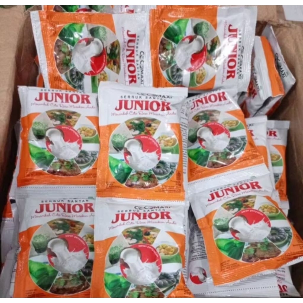 Santan bubuk "Junior" biasanya adalah produk santan kelapa yang diproses menjadi bubuk, dengan tujuan untuk memudahkan penggunaan santan dalam berbagai masakan dan hidangan. Produk ini sering digunakan sebagai alternatif praktis dari santan cair, dan biasanya dikemas dalam sachet atau kemasan kecil untuk penggunaan sehari-hari.