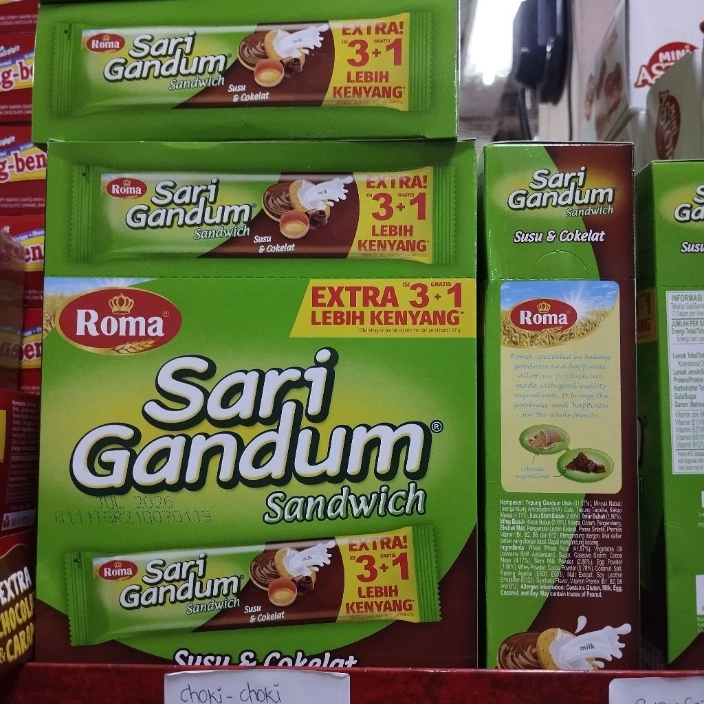 Sari Gandum Roma 1 dus isi 12pcs kemasan baru isi 3 + 1 keping per kemasan