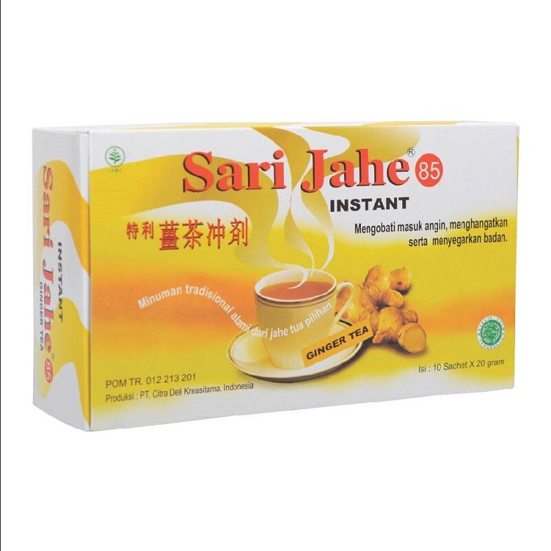 Sari Jahe 85 (Ginger Tea) terbuat dari bahan baku jahe tua pilihan tanpa campuran bahan pewarna dan pengawet yang diolah dengan teknologi modern dan higienis. Minuman herbal instant Sari Jahe 85 (Ginger Tea) sangat aman untuk dikonsumsi oleh semua kalangan baik anak-anak maupun orang tua karena memiliki khasiat untuk menghangatkan dan menyegarkan tubuh. Selain itu Sari Jahe 85 (Ginger Tea) sangat baik diminum dalam keadaan hangat maupun dingin.