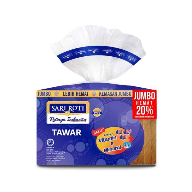 SARI ROTI Roti Tawar Jumbo 555 g adalah roti tawar siap santap yang memiliki tekstur lembut. Roti tawar ini dapat disantap langsung atau diberikan olesan selai favorit Anda untuk menambah cita rasa. SARI ROTI Roti Tawar terbuat dari bahan-bahan pilihan dengan komposisi tepung terigu, air, gula pasir, lemak reroti, ragi, garam, susu bubuk, kalsium, pengemulsi nabati, pengawet kalsium propionat. Jadikan menu sarapan semakin spesial dengan mengkreasikan SARI ROTI Roti Tawar Jumbo 555 g ini sesuai selera Anda.