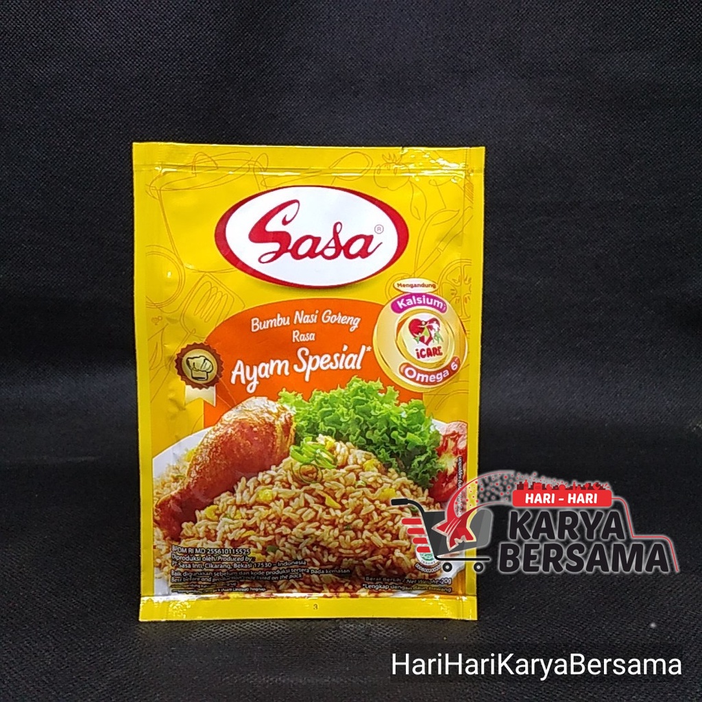 Sasa bumbu nasi goreng rasa ayam spesial adalah bumbu praktis siap masak dari sasa yang diracik khusus untuk memasak nasi goreng dengan mudah dan cepat tanpa harus diolah.lengkap dengan ekstrak ayam dan daun bawang sehingga rasanya lebih lezat,nikmati lezatnya nasi goreng buatan sendiri dirumah dengan sasa bumbu nasi goreng rasa ayam spesial.