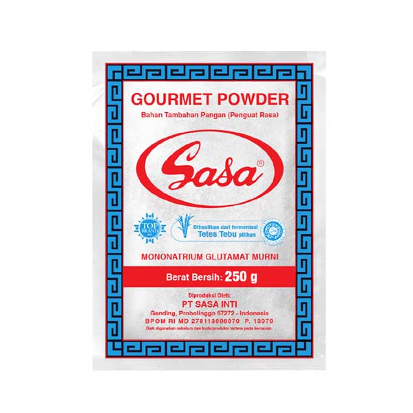 Sasa MSG merupakan penyedap rasa kemasan sedang yang dipersembahkan oleh Sasa untuk cita rasa masakan yang lebih lezat di setiap santapan bersama yang hangat Penyedap rasa Sasa diracik dari bahan tetes tebu alami yang difermentasi sehingga dapat memenuhi kebutuhan asam glutamat alami seperti yang ada pada ikan udang daging sapi dan sayur mayur untuk Anda setiap hari Bahan tetes tebu alami tersebut diproses secara alami menghasilkan penyedap rasa dengan kualitas terbaik untuk masakan Anda dan