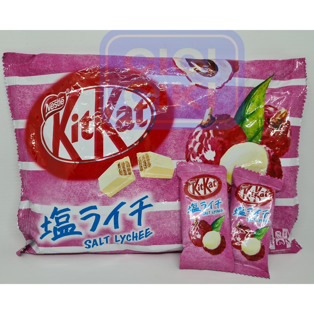 Perfect for summer with a salt made of Seto Inland Sea, one of Japan’s most salted areas, with white chocolate mixed with a refreshing smell and mild acidity lychees powder grown in a mild climate. These Kit Kats originally were released on June 24th in Japan, and highlight the local ingredients of the Setouchi region (Japan’s top lychees growing region), mixing lychees and white chocolate along with the light, sweet-tasting salt of the Seto Inland sea for a refreshing snack. lychees are a popular summer flavor combination in Japan and the region of Setouchi is famous for both. The salt is meant to replenish the salt you lose when sweating, while the lychees gives you a refreshing mouthfeel. It is characterized by its taste. Limited Edition.