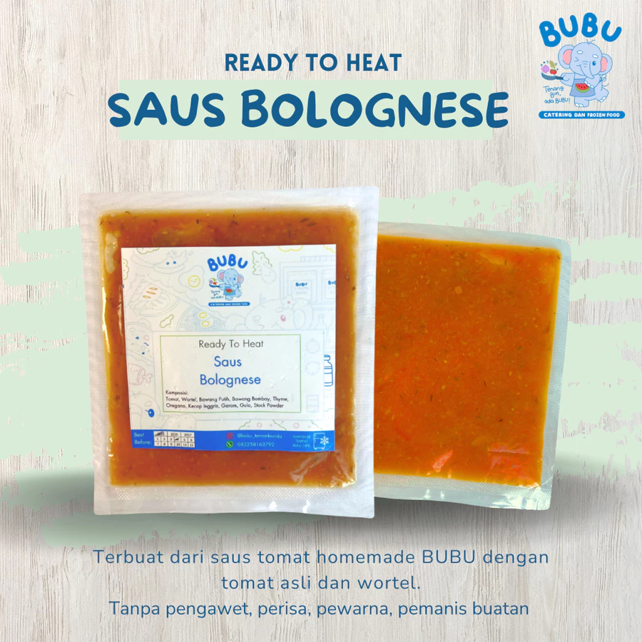 SAUCE Bolognese Original Bubu. Terbuat dari saus tomat homemade BUBU dengan tomat asli, wortel, aneka bumbu, lada dan garam. Tanpa pengawet, pewarna, perisa maupun pemanis buatan.