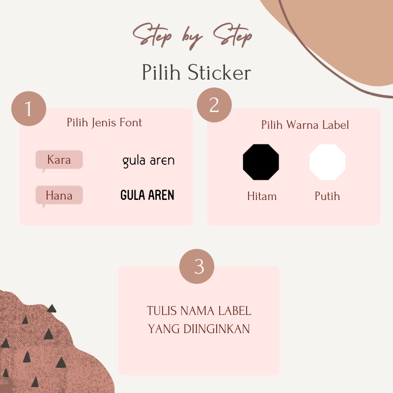 - SILAHKAN PILIH JENIS FONT DAN UKURAN LABEL, MOHON TULIS NAMA LABEL DI NOTES SAAT CHECKOUT