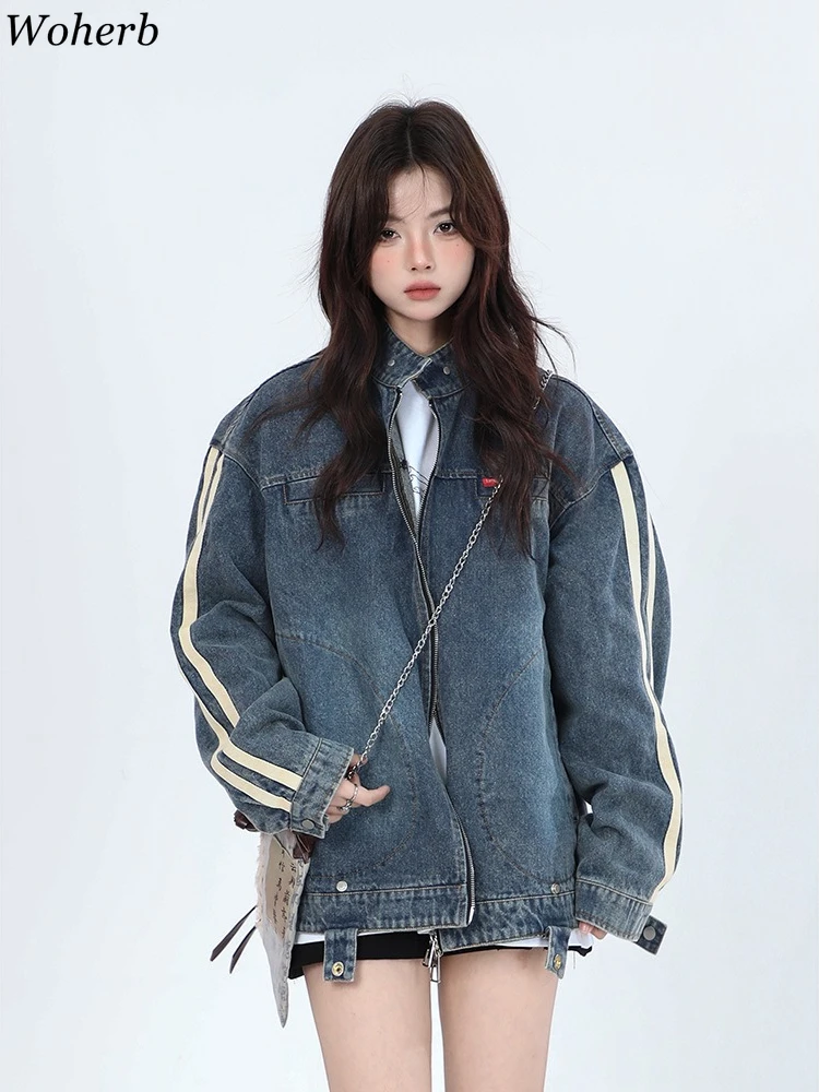 Винтажное джинсовое лоскутное пальто, женская одежда, модная корейская однобортная повседневная верхняя одежда, осень 2024, свободные куртки с воротником-стойкой