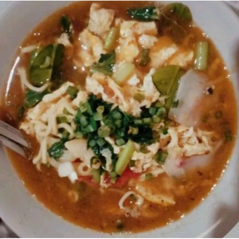 isi:sayur, telur, sosis merah kecil, kerupuk, mie, cumi, penthol