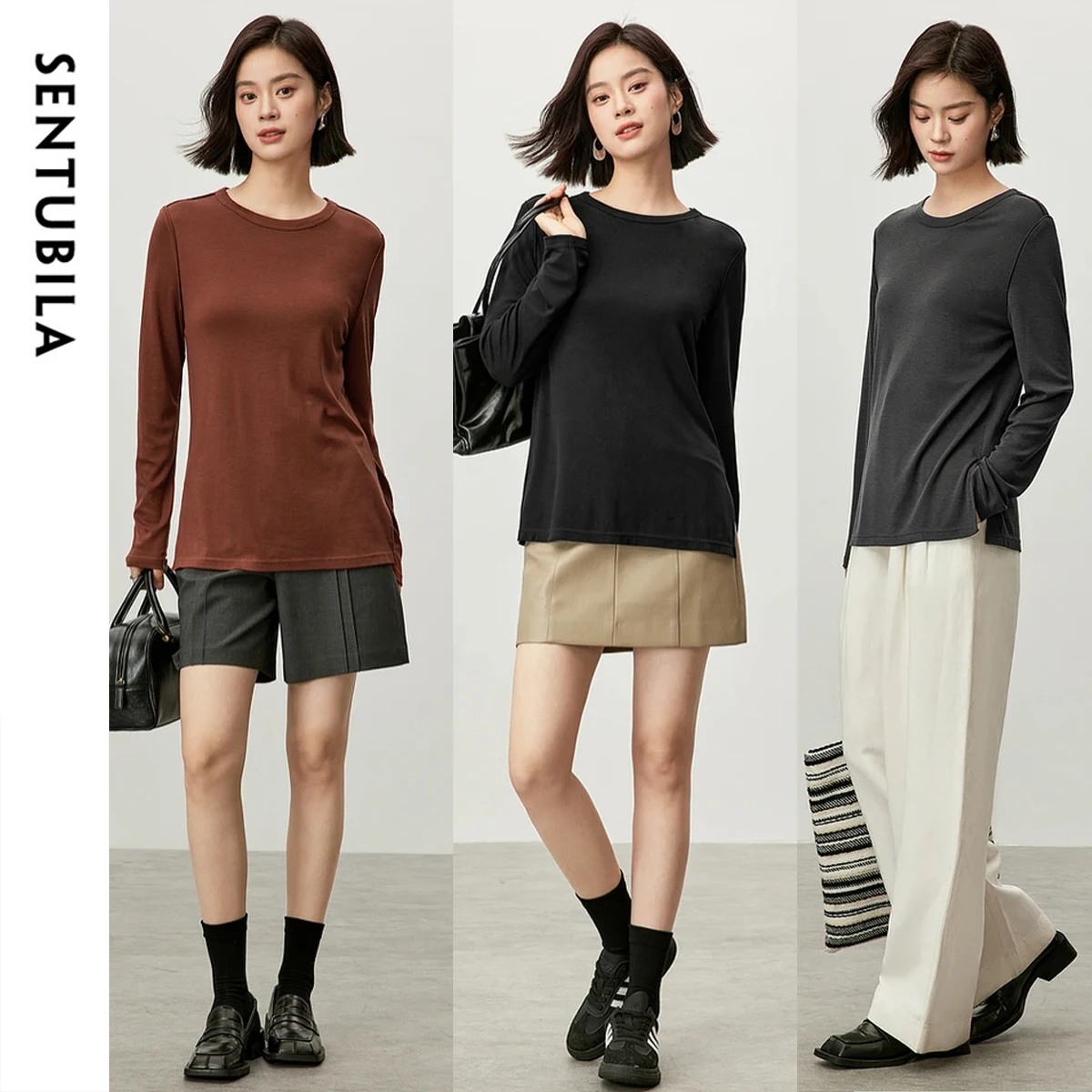 SENTUBILA женская футболка из лиоцелла с круглым вырезом, осень 2022, повседневный однотонный простой пуловер с длинными рукавами и разрезом, топ 143T56782