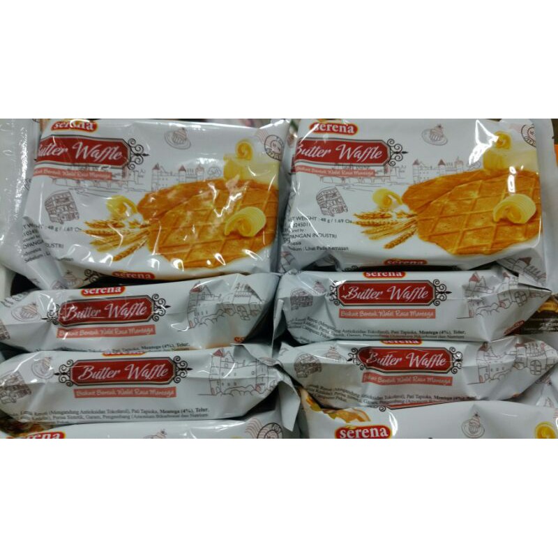 Serena Butter Waffle 48 gram. Kukis berbentuk waffle dengan rasa mentega yang harum dan nikmat.