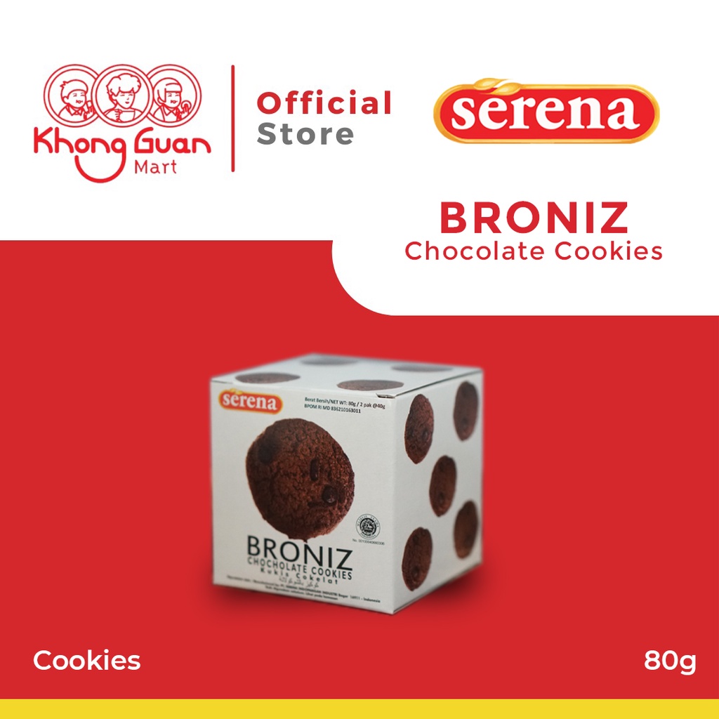 Serena Broniz 80 gram merupakan biskuit kukis cokelat dengan taburan chocochip diatasnya.terbuat dari coklat premium dan bahan berkualitas lainnya. cocok untuk teman santai, teman minum teh dan kopi.