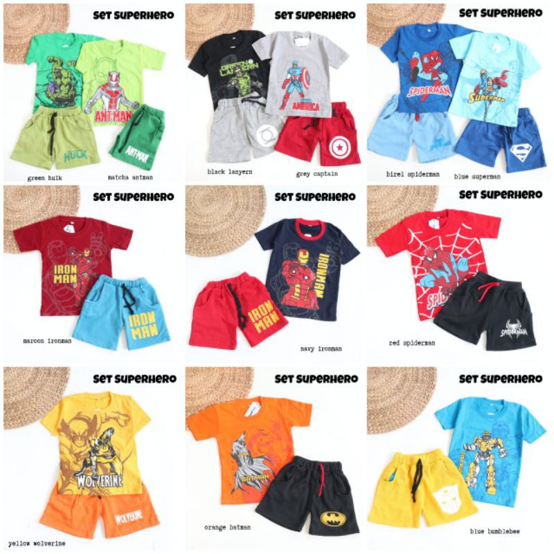 Superhero is back, setelan cowok favorit anak2, bahan atasan kaos combad 30s, bawahan baby tery fleece