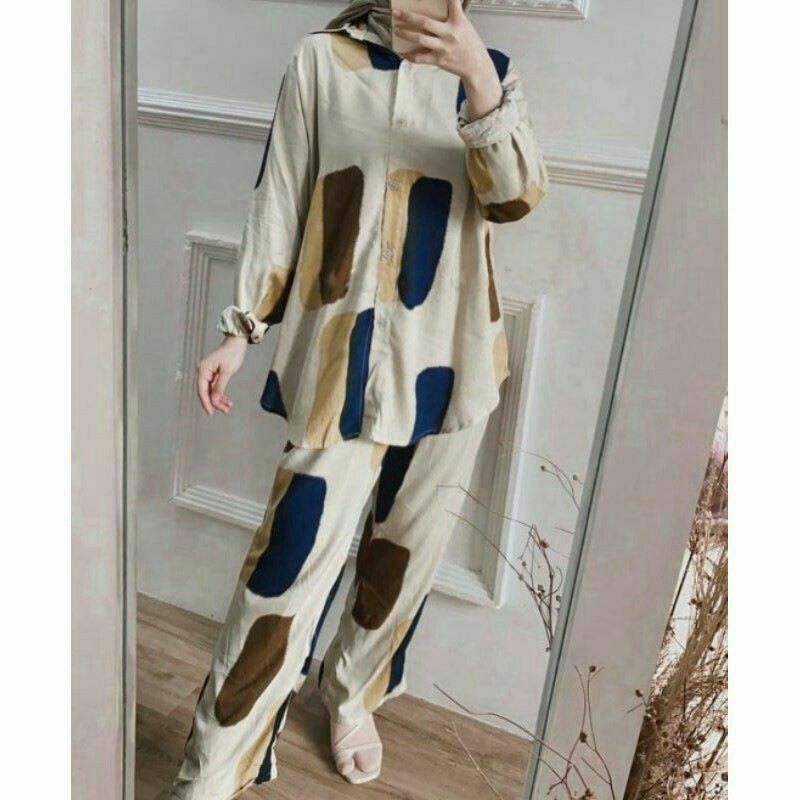 Setelan atasan busui full kancing depan, dipadukan celana pinggang full karet