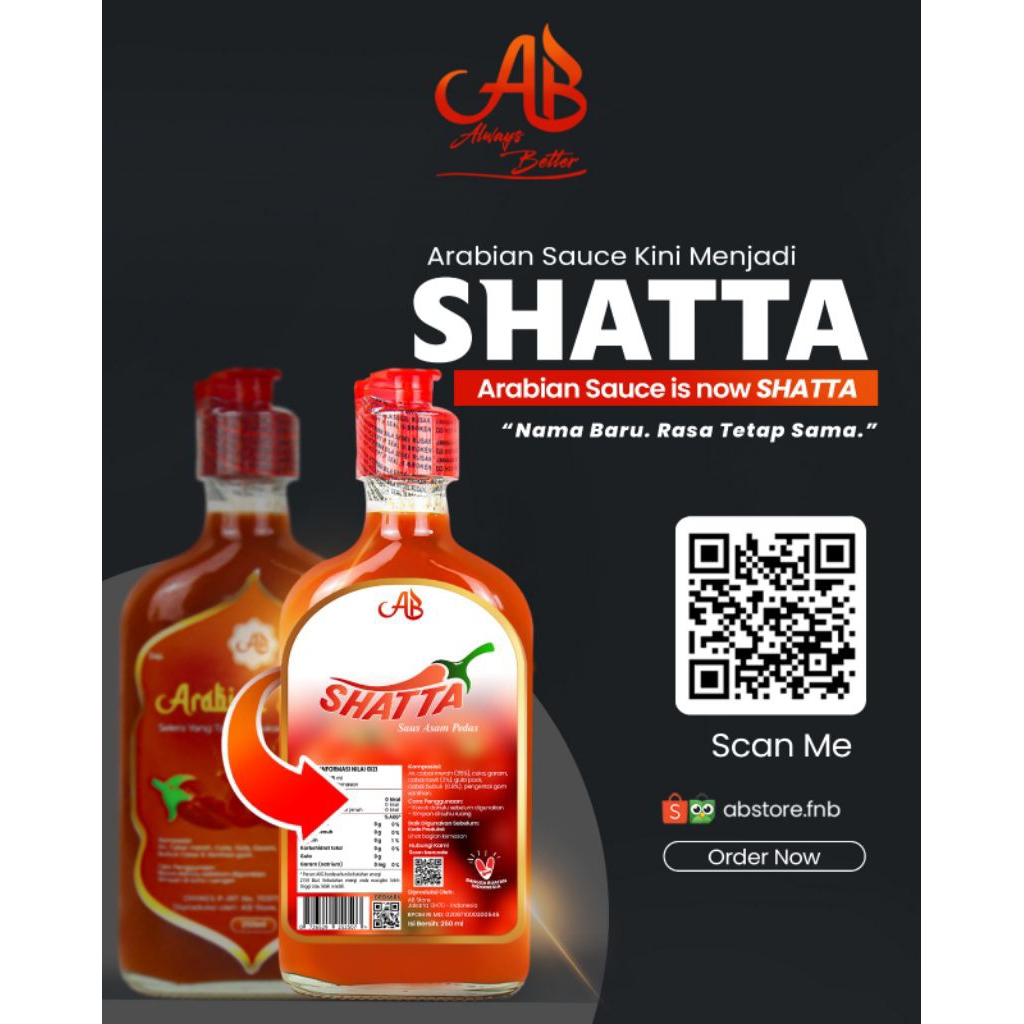 SHATTA adalah saus asam pedas terbuat dari 100℅ bahan alami seperti air, cabai merah, cuka, cabai rawit, cabai bubuk, gula, garam, pengental xanthan gum, dan TANPA BAHAN PENGAWET TAMBAHAN dan PEWARNA sehingga aman dikonsumsi setiap hari.