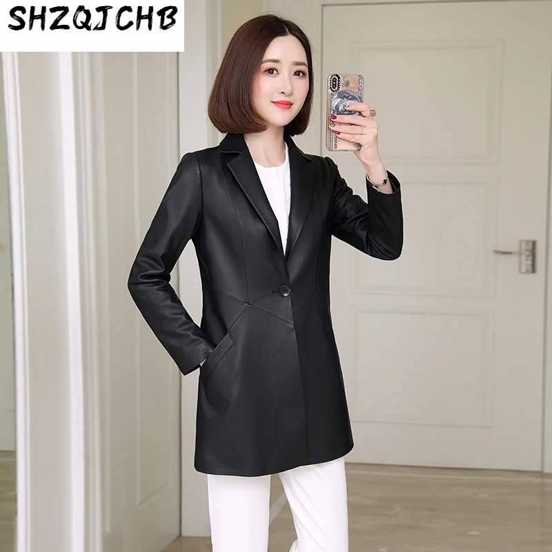 SHZQ кожаная одежда для женщин средней и длинной весны 2021 Новая ветровка из овечьей кожи пальто Тонкий Кожаный Костюм Co