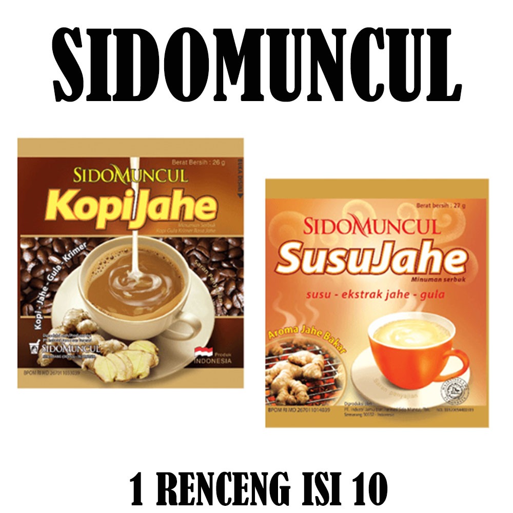 Sido Muncul Minuman Kopi Jahe Robusta dan Arabica merupakan minuman yang dibuat dari biji kopi pilihan hasil perpaduan kopi Robusta dan Arabica berkualitas tinggi, gula, susu yang kental nan gurih dengan perpaduan jahe bakar asli, sehingga menghasilkan kopi yang enak, wangi, dan mampu menghangatkan segala suasana. Kandungan gulanya lebih rendah dan cocok untuk Anda yang menyukai minuman rendah gula.