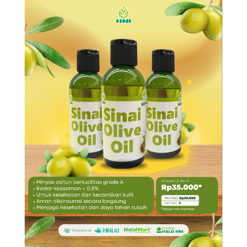 Sinai Extra Virgin Olive Oil adalah minyak zaitun berkualitas terbaik (grade A) yang diproduksi secara alami dengan aroma dan citarasanya istimewa dengan kadar keasaman kurang dari 0.8%.