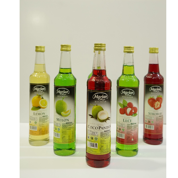 Sirup Marjan dikemas dalam botol kaca. Rasa Cocopandan dan Melon adalah dua rasa paling populer dan favorit keluarga sejak lama, cocok untuk segala acara.