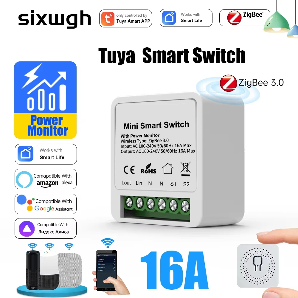 SIXWGH 1CH 2 Way 16A Mini Smart Switch for Home for Tuya Zigbee+RF Relay Power Monitor Function Google Home Alexa Integration 22