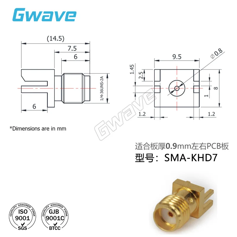 SMA Female печатная плата край шина-типный коннектор pin Расстояние 1 мм квадратный шасси 9,5 мм