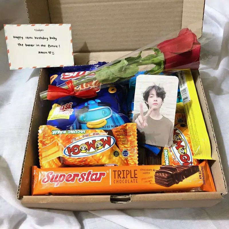 ♡Box termasuk: snack (sesuai tema warna yang diinginkan namun isi kami yang tentukan) , kartu ucapan (bisa riquest Brithday card dll) , Tali rami , Tankyoucard , Bubble warp (Bisa tambah Bubble ekstra agar lebih aman