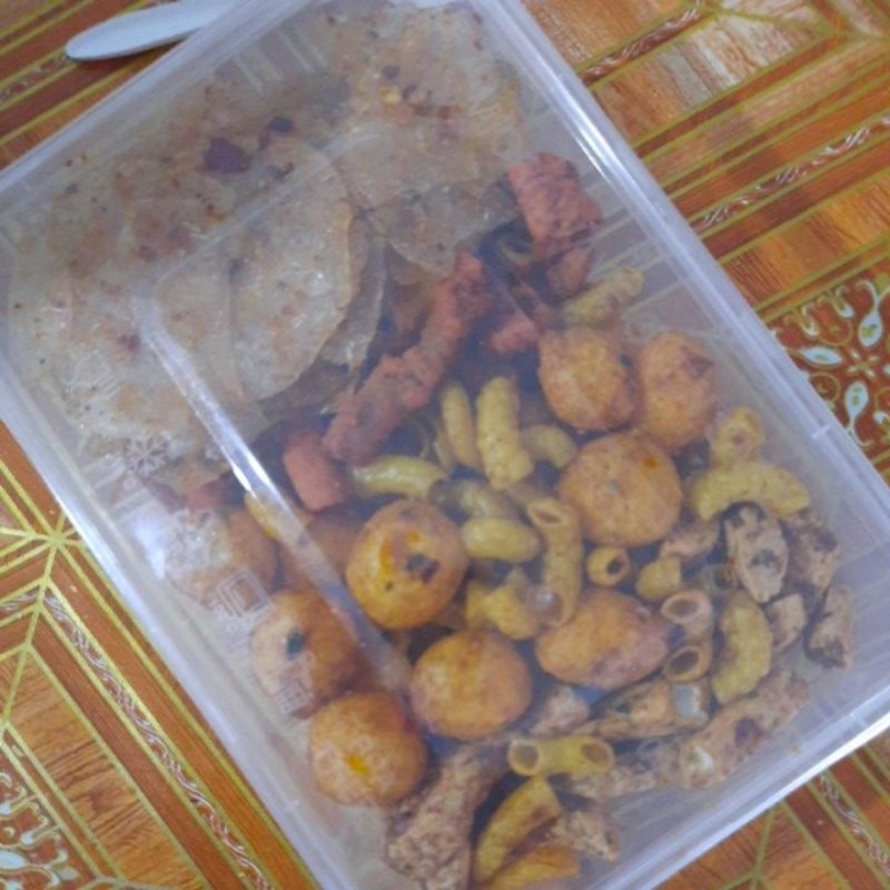 Bebas campur minimal 5 jenis cemilan, mohon tulis di catatan (Basreng pedas daun jeruk, basreng ori daun jeruk, makaroni pedas daun jeruk, makaroni spiral, kripik kaca pedas daun jeruk, cimol crispy pedas daun jeruk, soes coklat lumer, mie gulung, usus crispy pedas) tergantung persediaan stok